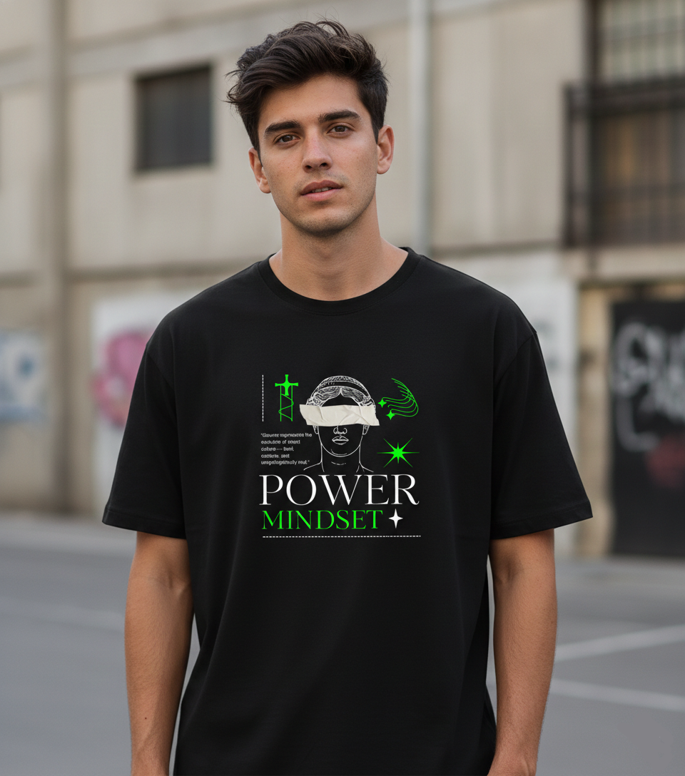Bold Graphic Art: A high-contrast “Power Mindset” print featuring a blindfolded classical bust and sharp neon green accents for a standout urban look.